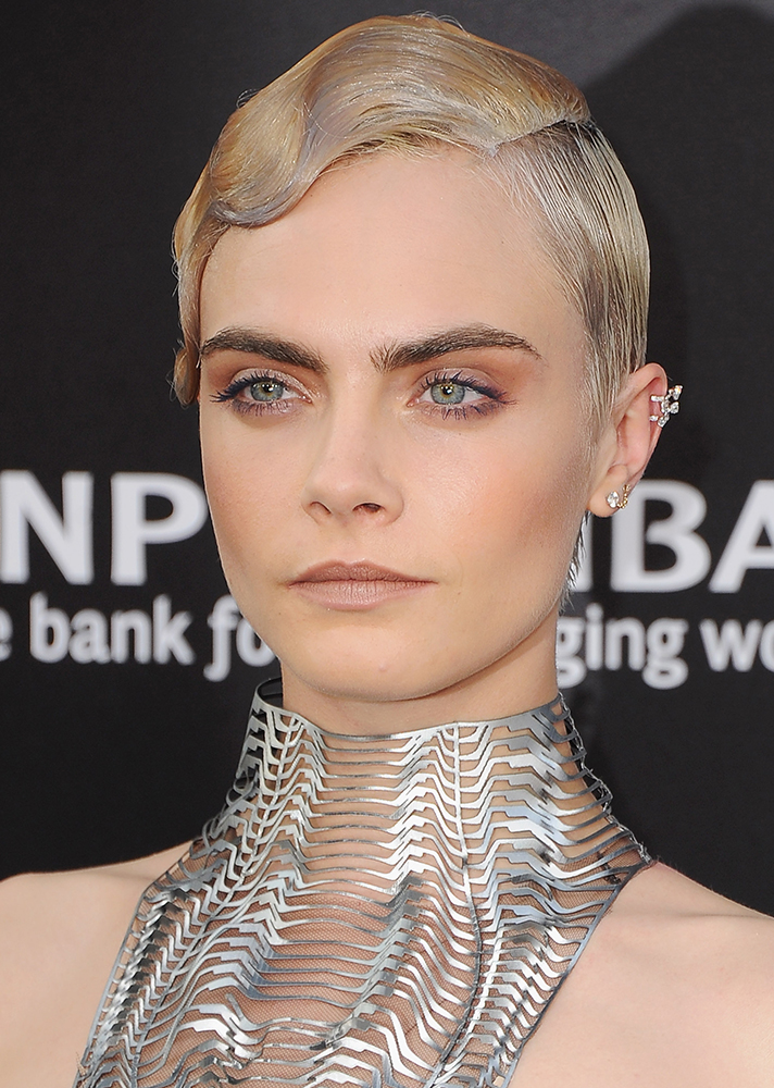 Remember when Cara Delevingne, she who gives zero fucks, straight-up shaved her head in April? Sure, it was for a role, but ever since, our beauty-obsessed selves have waited with bated breath for every one of the model slash actress’s red-carpet appearances for major buzz cut inspo. And honestly, we thought her giant scalp tattoo or blue mermaid waves took the cake as our favorites, until Delevingne arrived at the “Valerian” Hollywood premiere wearing 1920’s silver and gold-tinted finger waves.