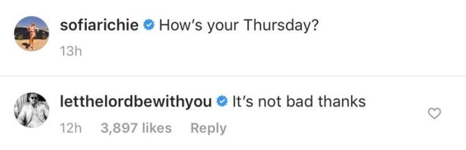 Her blonde hair and pout (and also the fact that she’s not wearing a shirt) was just too much for Disick. Richie captioned the shot, “How’s your Thursday?” Naturally, Disick took the opportunity to poke a little fun at Richie. Instead of going for the obvious “you’re gorgeous” or writing out his inner monologue (which we’re guessing sounds something “omg wtf ur stunning how did I get so lucky?”), Disick joked with her little. The reality star replied, “It’s not bad thanks.” LOL. He didn’t even acknowledge the fact that she’s not wearing clothes. He also just made fun of her a little bit because like, how do you ask such a simple question when you post a pic like that? The banter is all in good fun. We love it.