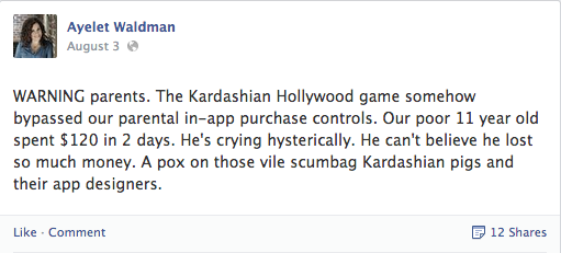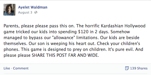 Well, one author and mother Ayelet Waldman has had enough, and took to social media to pen an epic rant against the Kardashian game after her 11-year-old apparently spent $120 over two days on the game, by accident (h/t to Gawker). According to Waldman, her son was “crying hysterically” upon realizing he’d gone way over his allowance. The author blames Kardashian “trickery” for the ruse, claiming the game “preys on children” and is “pure evil.”