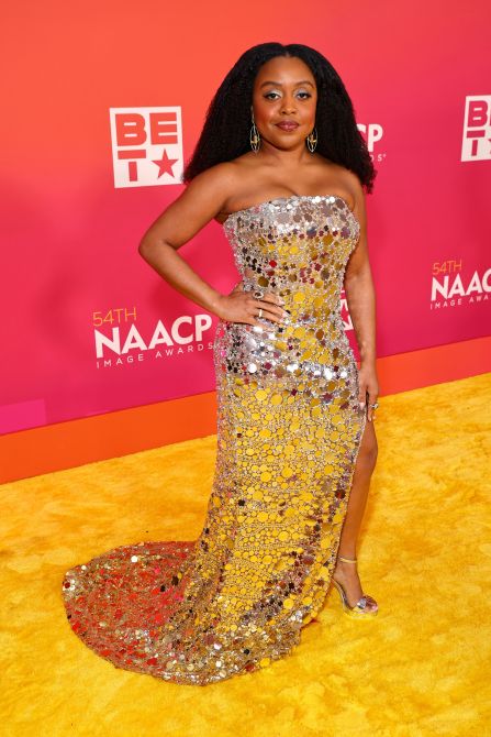 Quinta Brunson wears Aliétte.