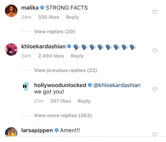 We don’t know the exact meaning of these emojis, but our guess is that she’s agreeing with the post and perhaps subtly confirming the reports? Kardashians best friend, Malika Haqq, commented on the same post writing, “STRONG FACTS.” Kardashian’s older sister, Kim Kardashian, also liked the photo.