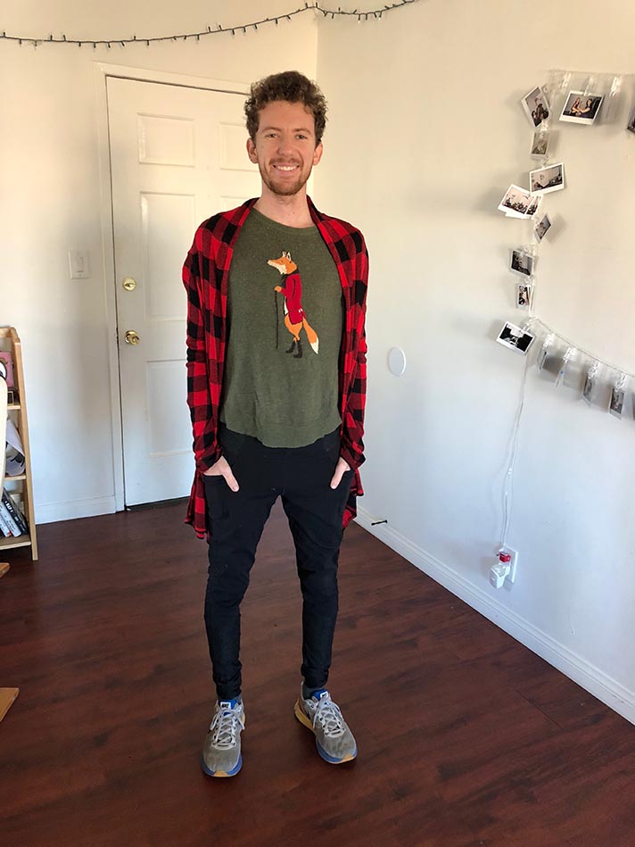 Danny’s other favorite thing about my wardrobe (obviously a second distant to its pajama-like quality) was the variety of color he had. “They weren’t brown or blue like everything else I own.” He said it was fun to try styles and pieces he wouldn’t find in a standard men’s section—stuff like my peach bomber jacket or my long plaid shawl. He thought my closet had some flair to it, and wearing it made him feel like he looked “how celebrities or basketball players dress—edgy, but not pushing it too far.” He was able to find some freedom of expression in my more versatile wardrobe while still remaining in a space that was comfortable for him.