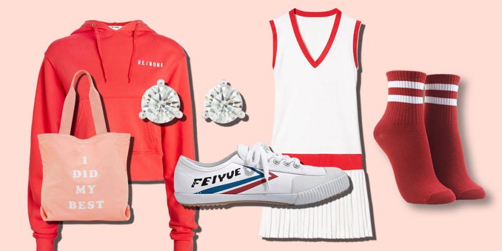 Lightbox Solitaire Studs in White, $400 at Lightbox; Hard Crop Cotton-Jersey Hoodie, $250 at Re-Done; Performance V-Neck Tennis Dress, $198 at Tory Sport; Feiyue Fe Lo Classic Sneakers, $60 at Madewell; I Did My Best Tote, $18 at Ban.do; Varsity-Striped Crew Socks, $4 at Forever 21.